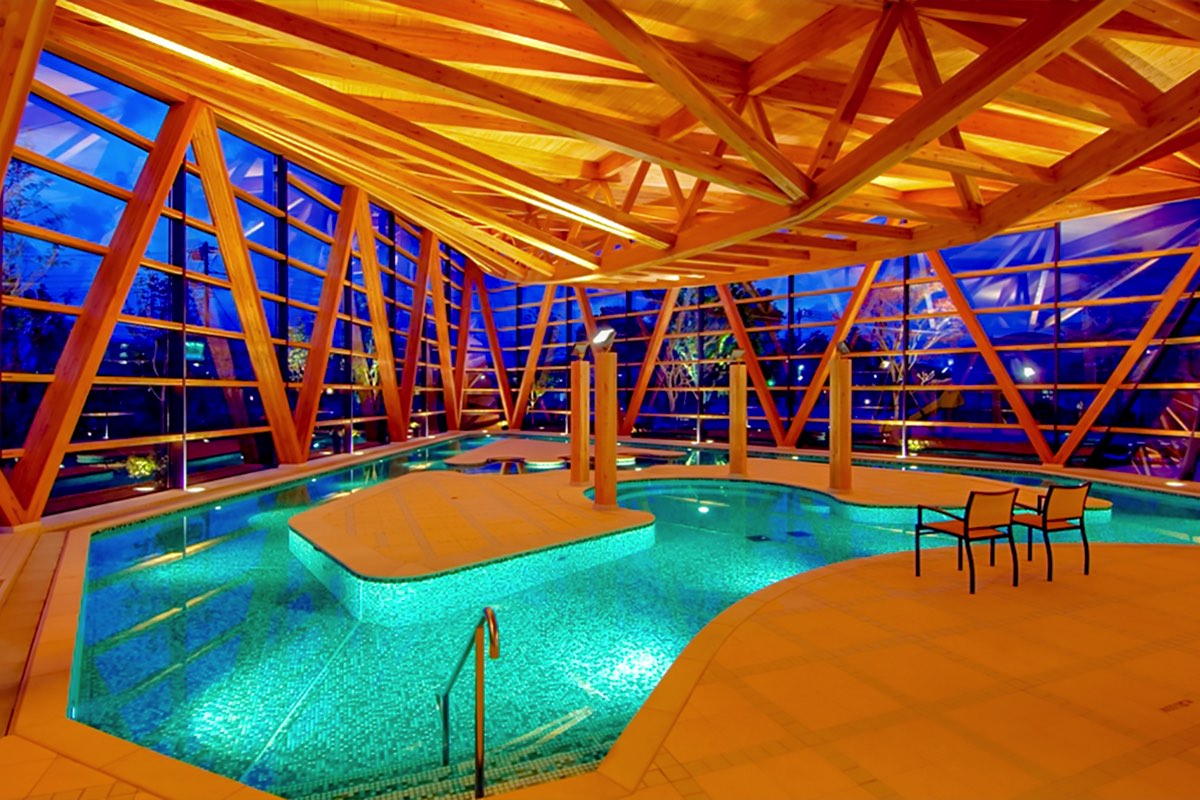 1年中、温泉とプールが楽しめて、室内プールの「ウォーターガーデン」では、45mの流れるプールが子どもたちに大人気!