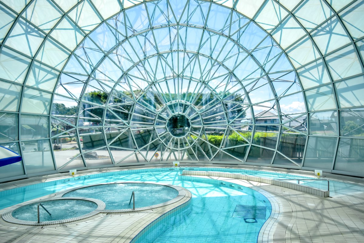 ドーム型の建物が印象的な「韮崎市健康ふれあいセンター ゆ〜ぷるにらさき」。