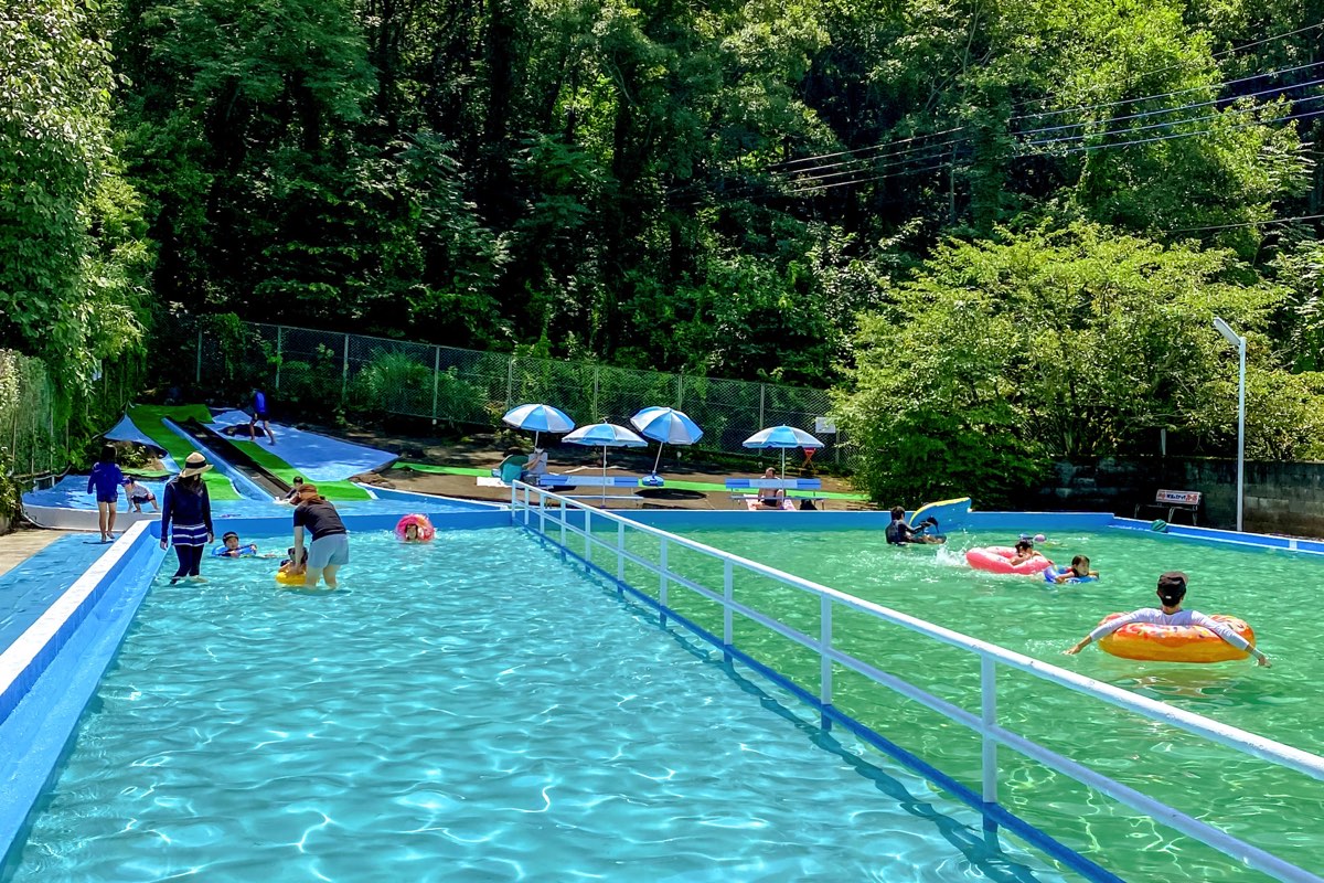 甲府市岩窪町にある「つつじヶ崎温泉プール」は、豊かな自然に囲まれた昔ながらの屋外温泉プール。