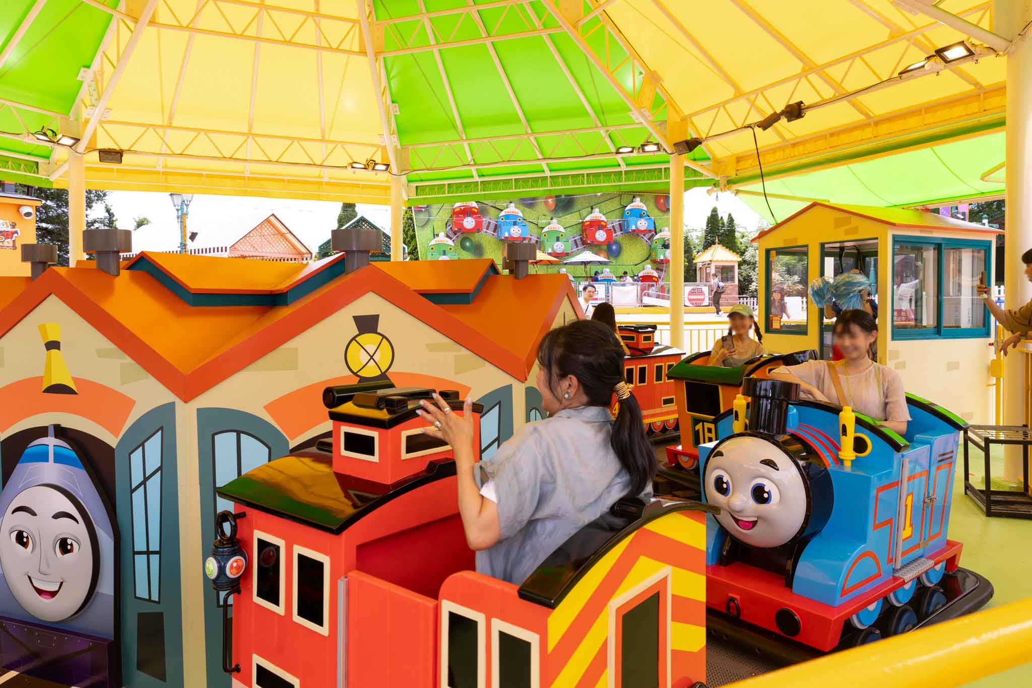 さっそく1つ目、「トーマスとダンシングパーティ」にライドオン!「トーマス」や「ニア」そしてニューフェイスの「ブルーノ」などのライドに乗り、軽快なBGMに合わせて機関庫の周りをくるくる回るアトラクションだ。