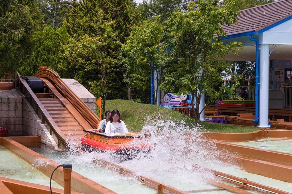 水の上をぷかぷかと浮かびながら進むとすぐに、川のそばで遊ぶ「トーマス」と「ニア」がお出迎え。さらにその先にはゆっくりと坂を上り、そのままスリリングに水の中へ。少し水しぶきがかかり、とっても涼しい~。