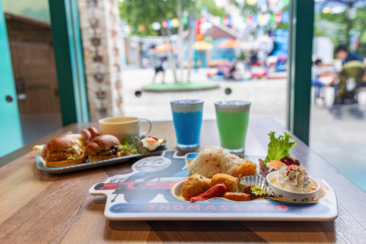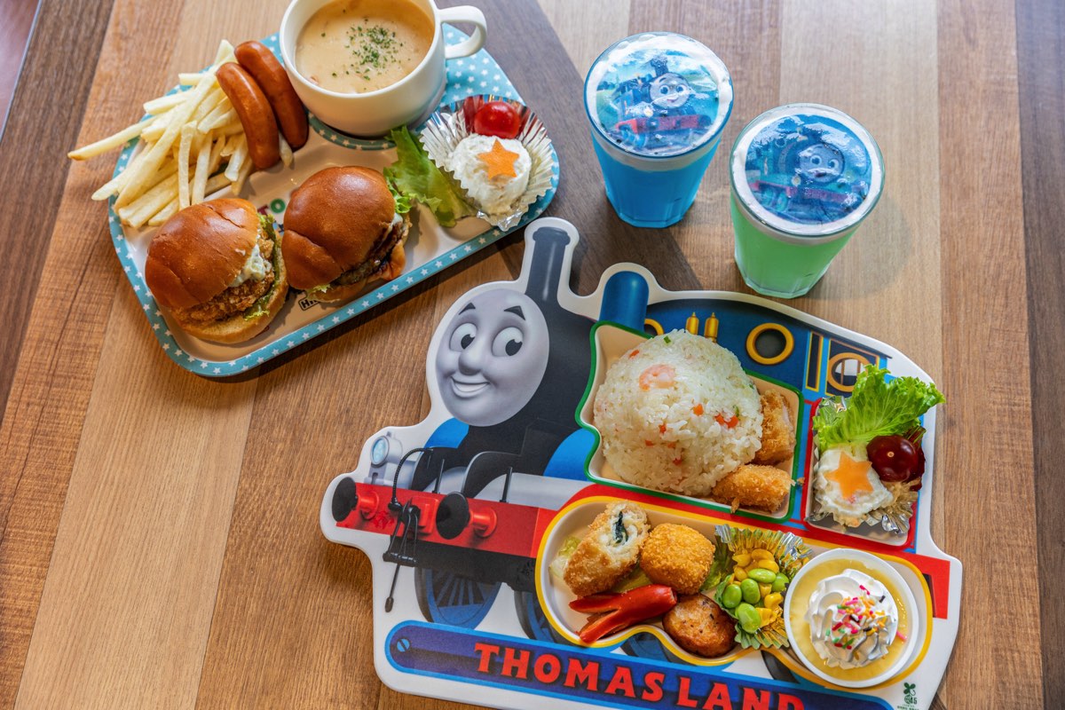 揚げ物やピラフ、プリンなど、子どもが好きなメニューが詰まった「トーマスデラックスプレート(3,300円)」や海老カツと照り焼きハンバーグの2種類のミニバーガーが入った「ウキウキバーガープレート(2,500円)」など、ボリューム満点なメニューが並ぶ。どちらもスーベニアは持ち帰りできるので、おうちで楽しむことも。また、たっぷりの生クリームの上に、トーマスとパーシーがプリントされた「トーマス・パーシードリンク(750円)」もあるので、ぜひ試してみては。