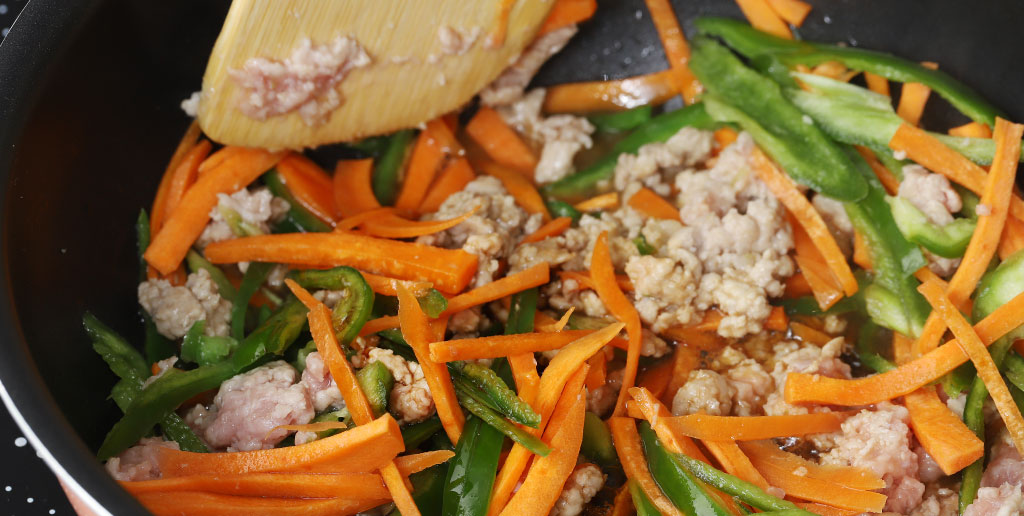 豚挽肉、ピーマン、にんじんを油で炒め、醤油・酒・みりん・砂糖・水で煮る。