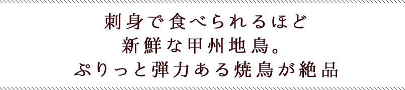ぷりっと弾力ある歯ごたえ、臭みのない肉の旨み・・・地鳥本来の味を堪能できるのは、お刺身で食べられるほど新鮮な甲州地鳥を使用しているから。その日に捌いた新鮮な甲州地鳥を店内で串刺しし、最高ランクの塩で味付け。人気のねぎ間はぷりっと噛み応えのある肉質が味わえる。朝引きのレバーは全く臭みを感じない、中がとろっとした仕上がり。