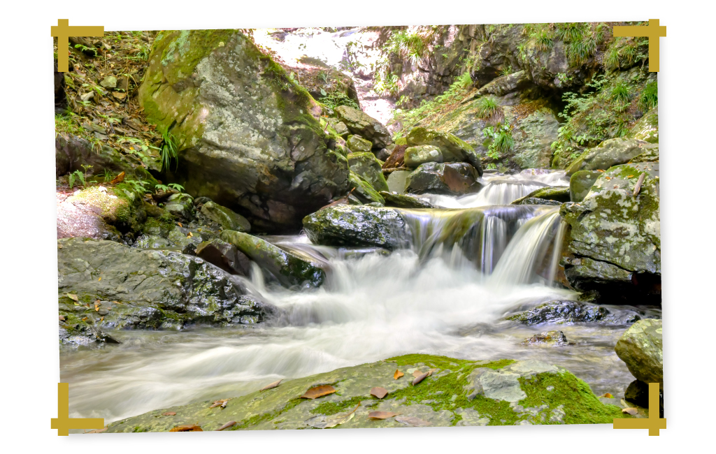 生い茂る木々や岩間から透き通るように溢れ出す清流