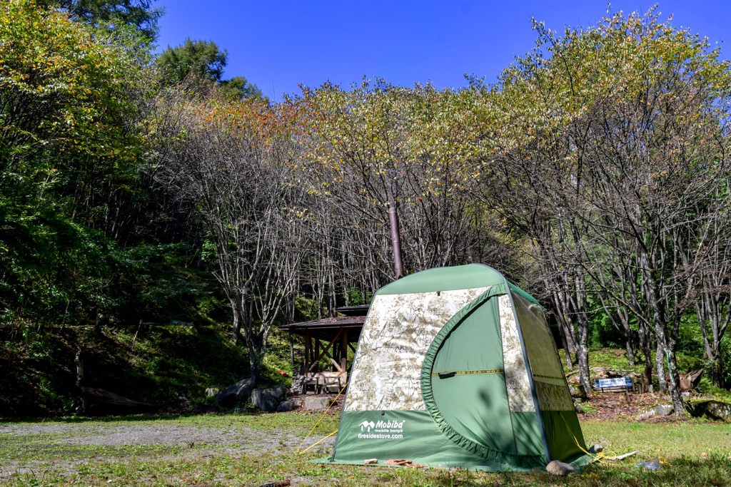 テント内は広々としていて、ふわ~と薪のいい香りが漂う。パチパチと薪が爆ぜる音や窓から覗く美しい紅葉に癒され、リラックスできそうだ。室温80℃ほどのテント内は、想像していたサウナとは全く異なり、湿度多めでじんわりと身体が温まって、とても心地がいい。