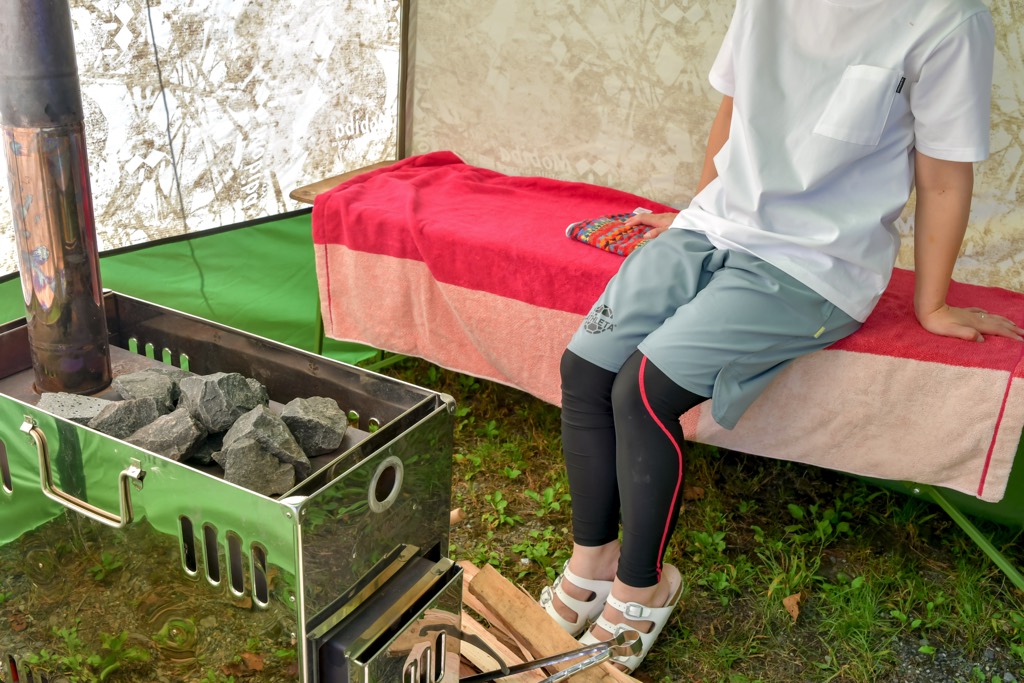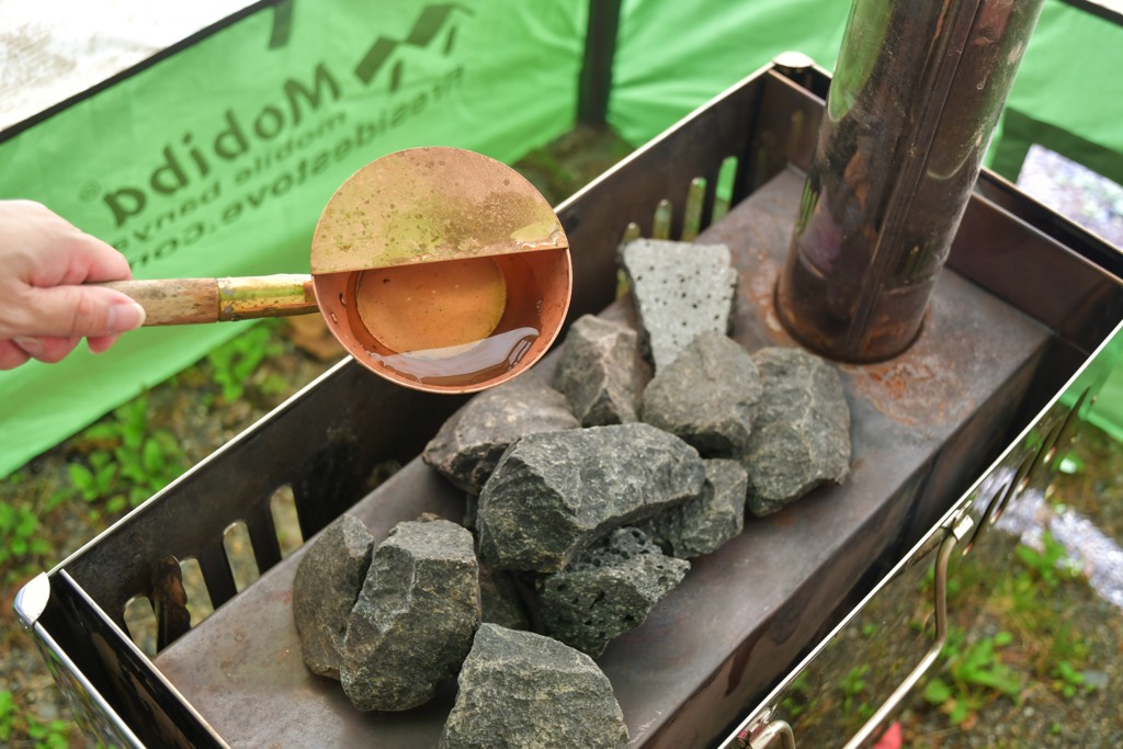アツアツのサウナストーンにアロマ水をかけると、ジューと音とともに大量の水蒸気とアロマのいい香りが立ち込める。ロウリュとはフィンランド語で「蒸気」を意味し、この蒸気を使ってセルフで温度調節し、自分の心地いい温度が楽しめるのもテントサウナならでは。