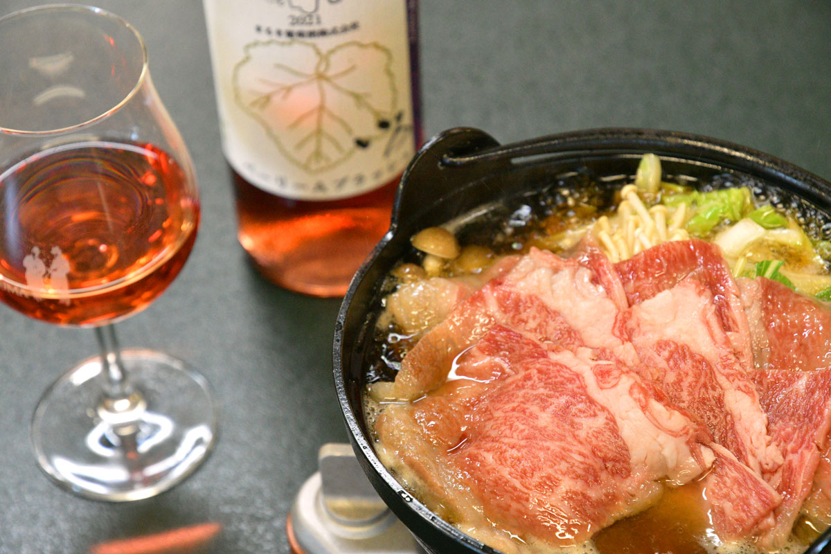 少し肌寒いな…と感じる日に活躍してくてくれるのが、すき焼き風牛鍋などのあったかいお料理。少し甘みを抑えたあっさり系牛鍋には、白ワイン製法(直接圧搾法)で、フレッシュな香り広がる辛口「マルキ いろベーリーAブラッシュ」を。