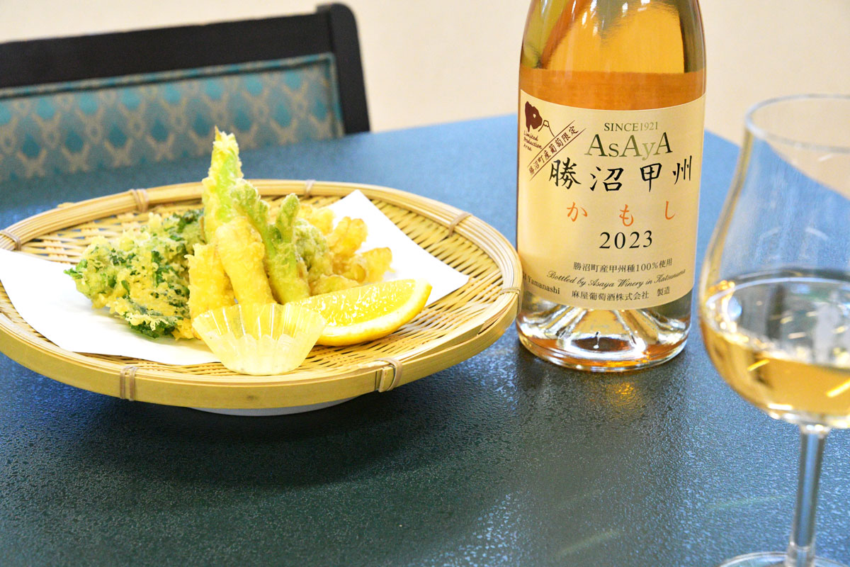 新芽の力強さが色濃く表れる春の味覚は、苦みやクセがある野菜が多い。レモンを絞るのと同じように、ワインで酸を足すという発想でペアリング!赤ワインのように果皮などを漬け込んで発酵、オレンジ色に染まった辛口オレンジワイン「麻屋 勝沼甲州かもし」で、苦味ある厚みを春の天婦羅盛り合わせと合わせて味わおう。