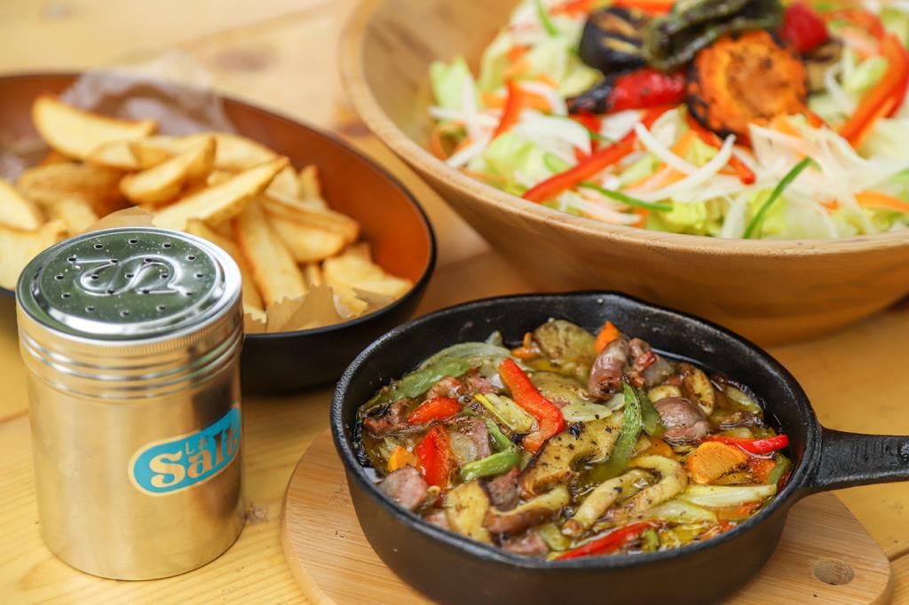 ズッキーニやトマトなど、野菜の自然な甘みもやわらか~い肉と一緒に堪能できるBBQ串や、砂肝の旨味たっぷりのアヒージョなどが付いた、ボリューム満点のAセットは1名3,980円(要予約2名~)。