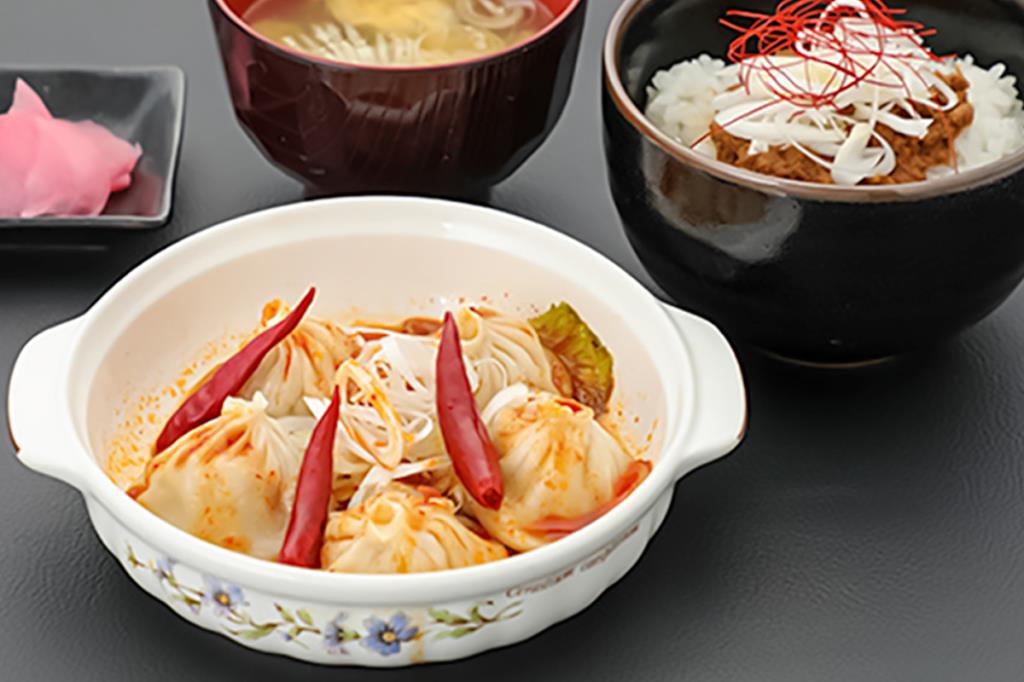 国産唐辛子をたっぷり使った、辛いだけで終わらない旨辛を堪能できるセット。小籠包とミニ坦々ご飯のセットで豪快に楽しもう。