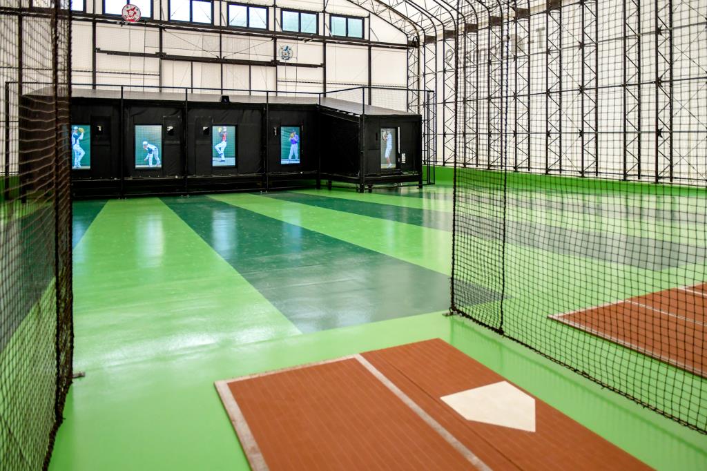 広々としたバッティングフィールドの液晶テレビにはアマチュア選手の投球画像が映し出され、リアル感も抜群!