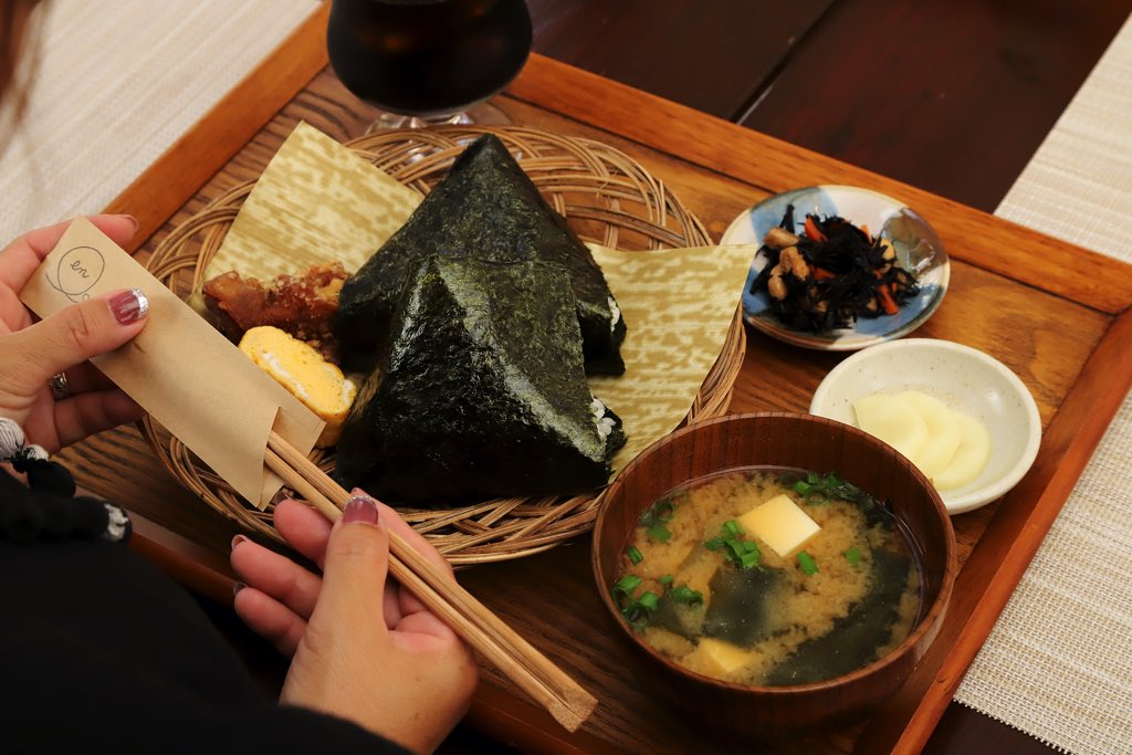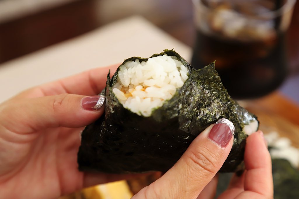 端まで具が入っていて食べ応え抜群の「おむすび定食」は、好きな具材の入ったおむすび2個とお味噌汁、唐揚げ、玉子焼き、小鉢、漬物付き。