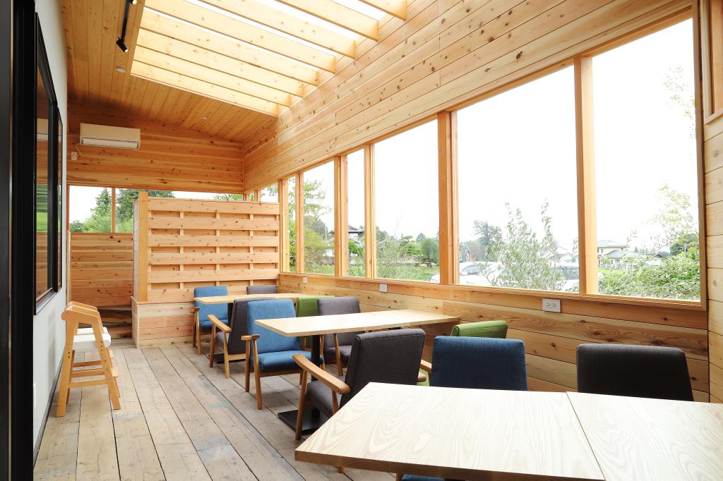 店内は木の温もりに溢れ、センスのいい家具やインテリアに囲まれて、とっても居心地のいい空間が広がる。大きな窓から明るい光が差し込むサンルームやカウンター席のほか、小上がりのボックス席も。