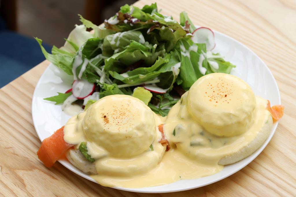 山梨県産の卵をとろけるポーチドエッグにして、自家製オランデ―ソースで仕上げたエッグベネディクト(1,580円)も魅力的!