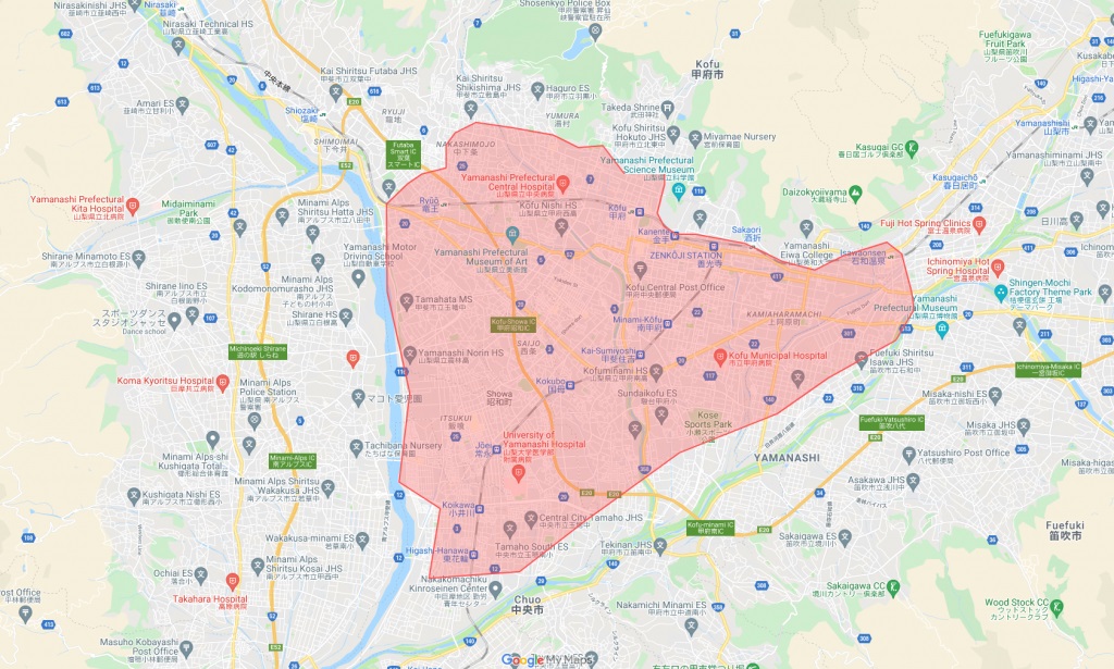 山梨でサービス開始!といっても現段階での配達区域は県内全域ではなく、甲府市と昭和町を中心とした画像内の赤い範囲のみ。