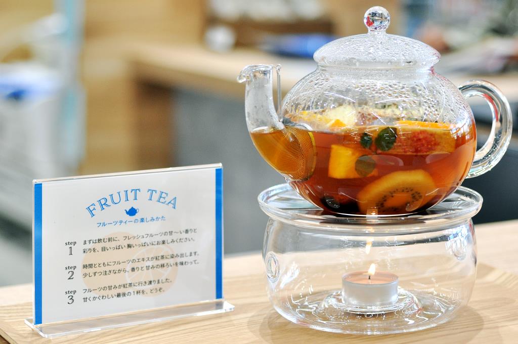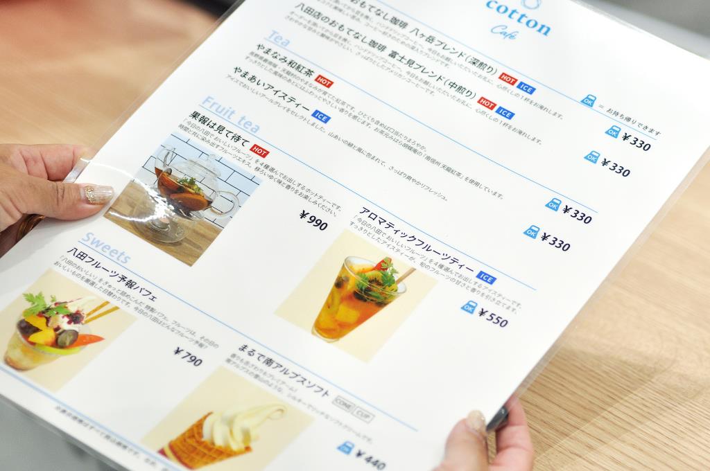 4種類のフルーツをポットに入れて、フルーツエキスと共に楽しむホットフルーツティ「果報は見て待て」(990円)や南アルプスの雪山をイメージしたミルキーなソフトクリーム「まるで南アルプスソフト」(440円)など。
