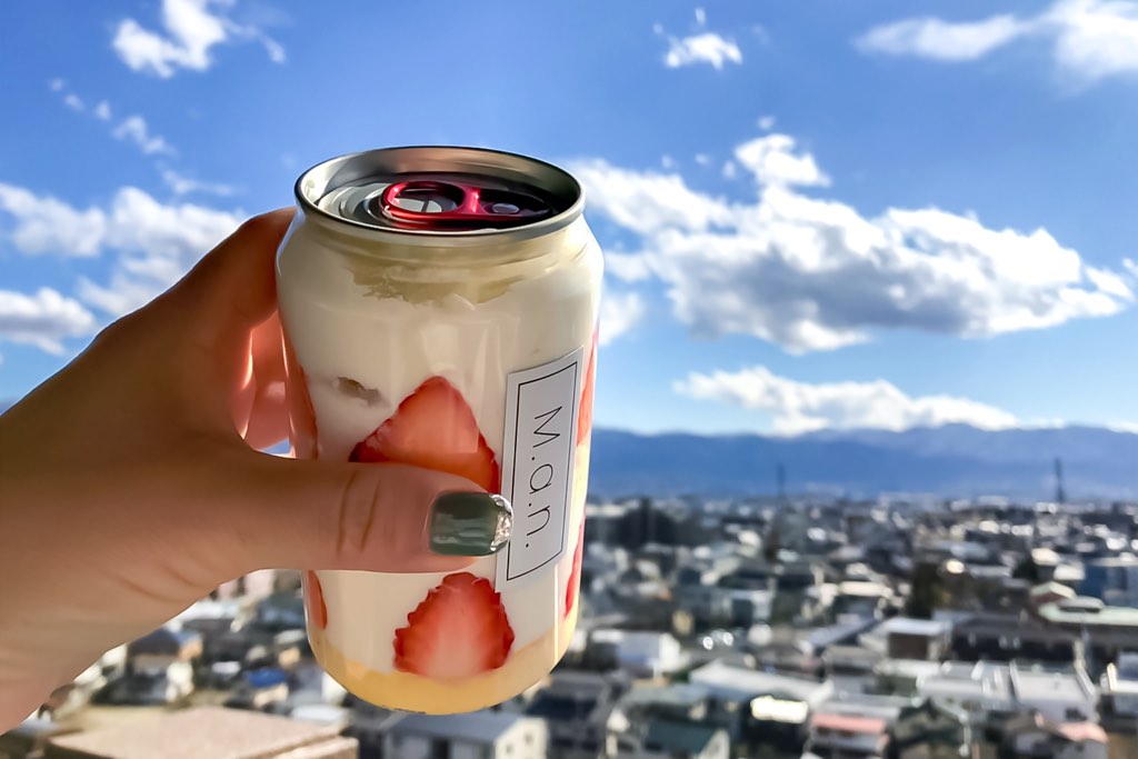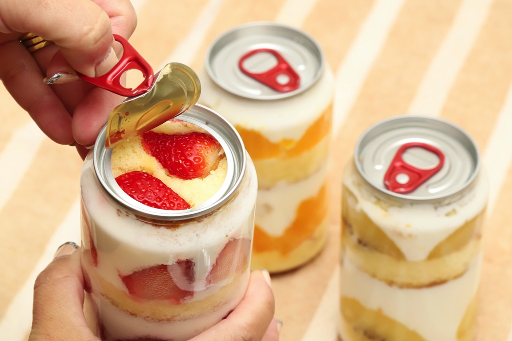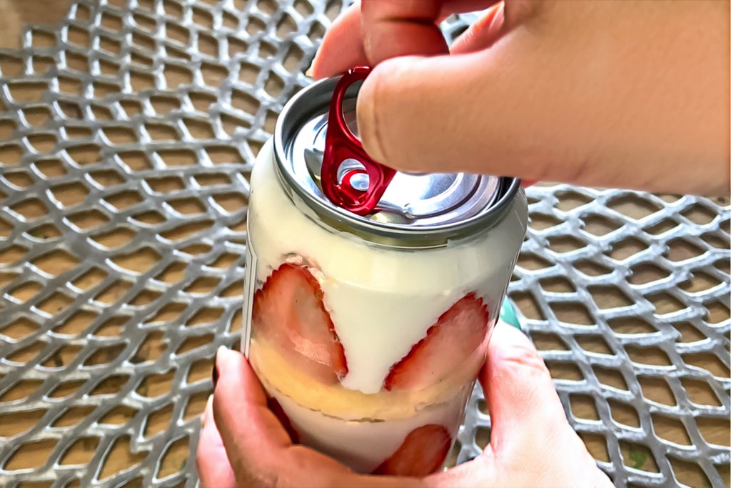 持っていると、まるで缶ジュース!でも、プシュッとあけたらなんと真っ赤ないちごがお目見え、缶に入ったふわふわショートケーキそのもの♪