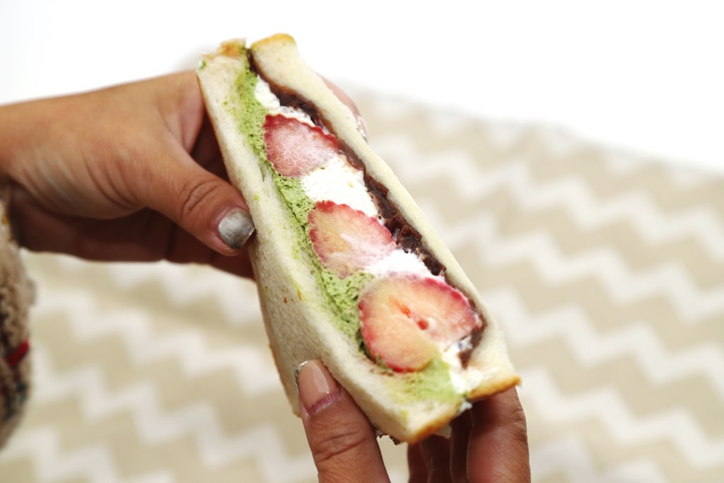 ココアの香りがしっかり立ったパン生地に、ジューシーなフルーツと生クリームを挟んだフルーツサンドは抜群の美味しさだ。