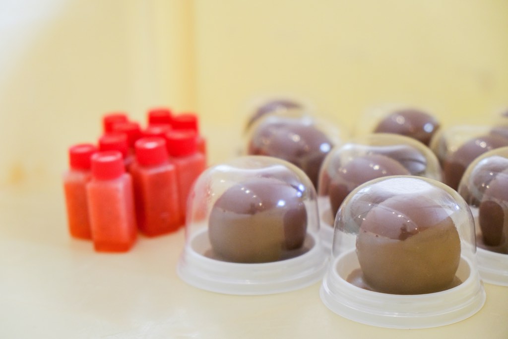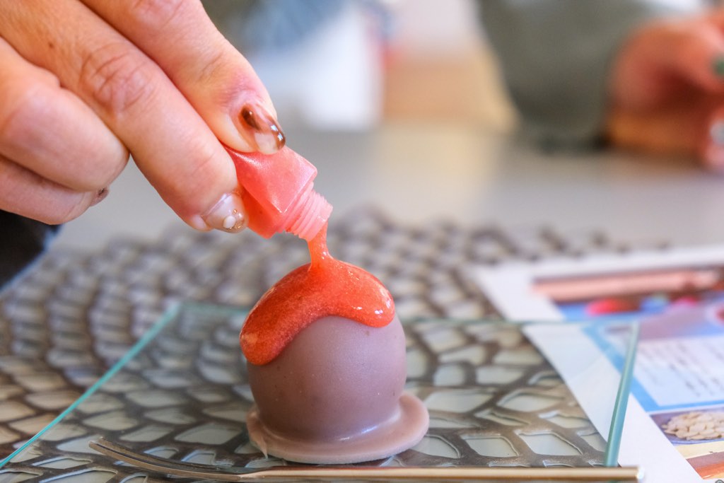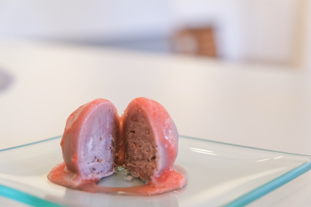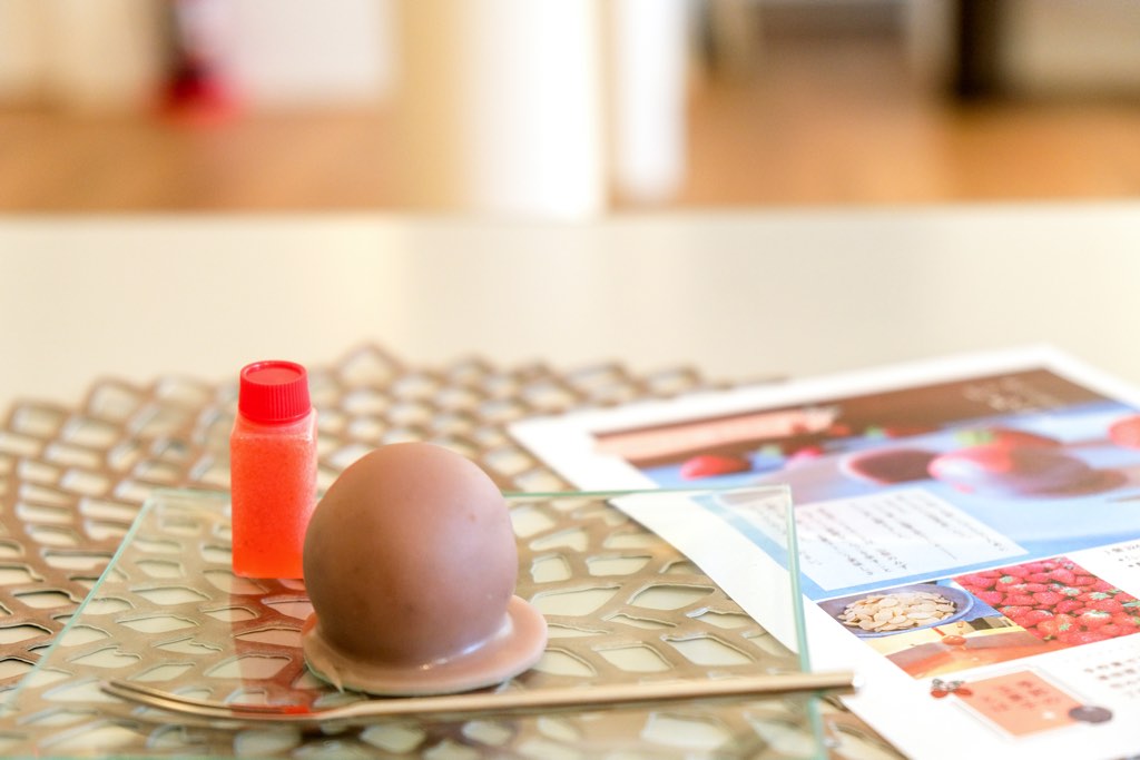 餡はいちごの水分のみで練り上げ、羊羹にはミキサーで細かくした苺を。いちごの自然な甘みに合わせ、甜菜糖餡や「KAOKA」のカカオ35%のホワイトチョコの配合を微調整し、上品なコクと深みを実現。