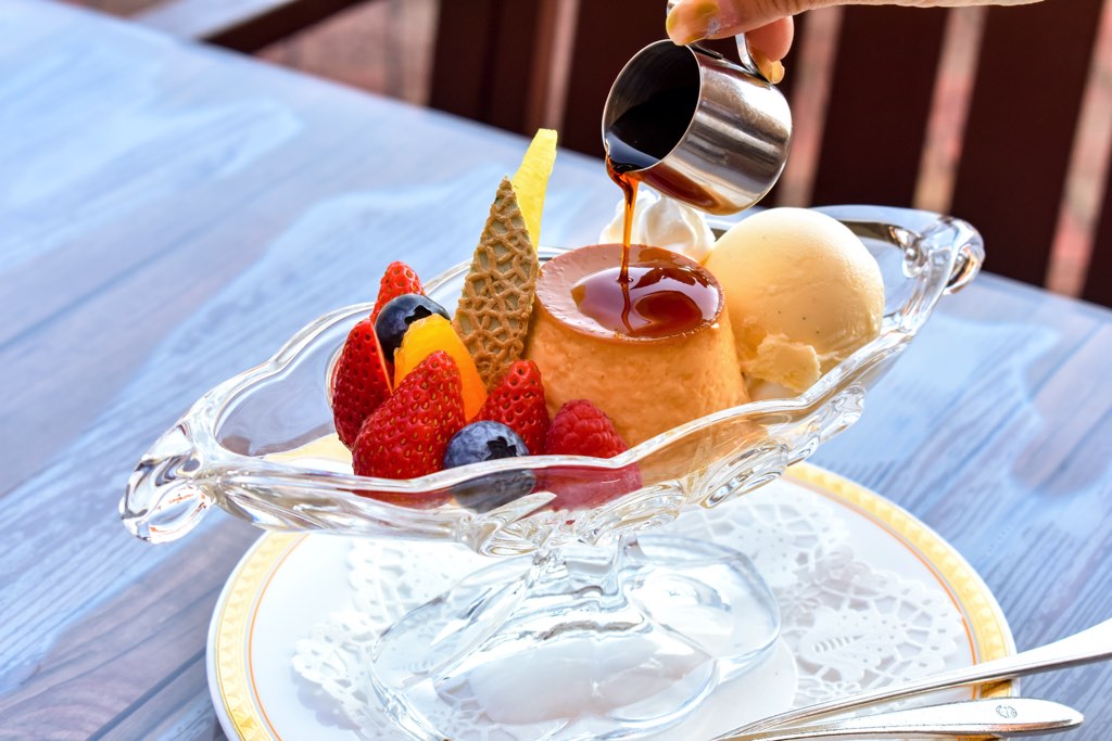 昔ながらの固めプリンは生クリームでコク深く、季節のフルーツとバニラアイスと共に。