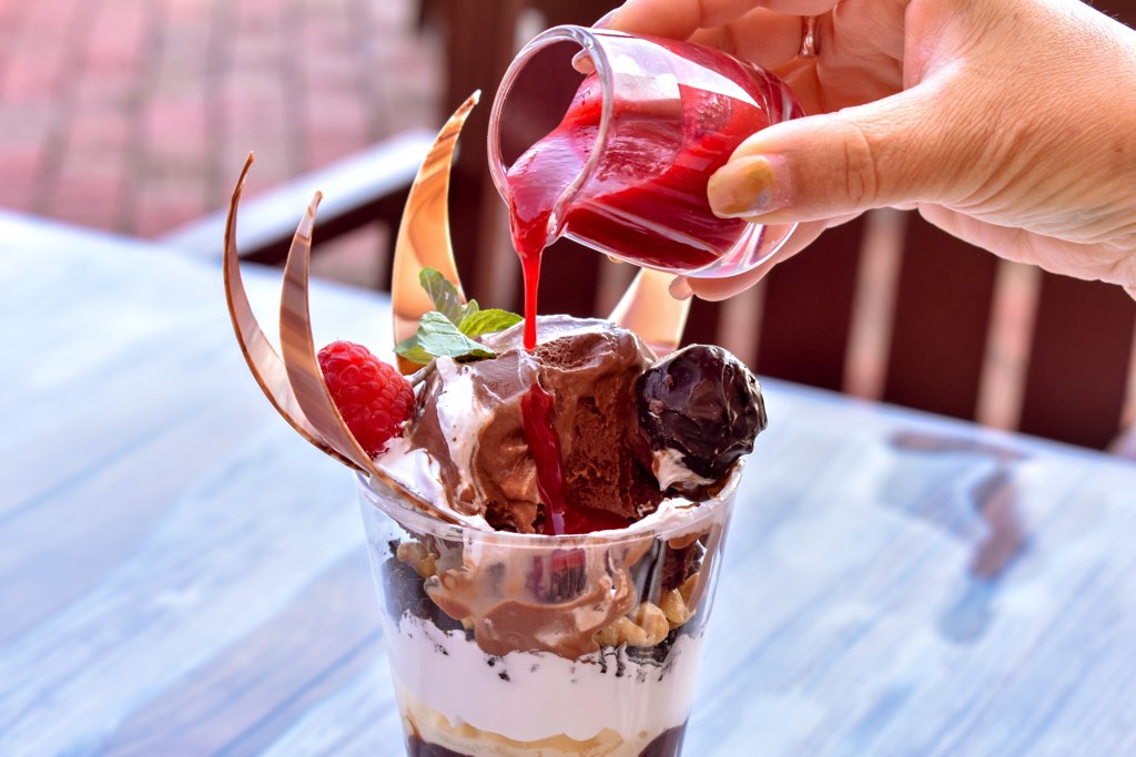 ビターなチョコレートアイスの下には、さらなるガトーショコラ、ココアクラインブル、ホイップクリーム、バニラアイス、チョコレートソースに…と何十層にもなって美味しさがたたみかける。