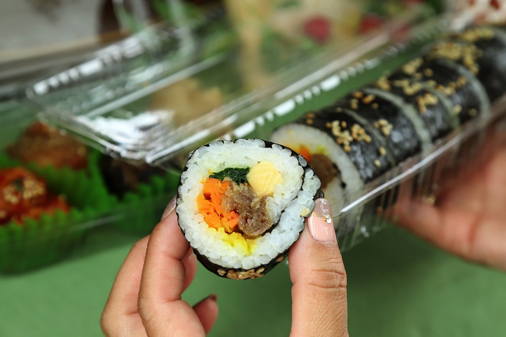炊きたてのご飯にごま油や塩を少しまぶして味つけし、厚焼きたまご、プルコギ、にんじんとほうれん草のナムル、たくあんを巻いた韓国版海苔巻きは、とにかく美味しくてパクパクイケちゃう♪全体のバランスが優秀で、ふんわりと巻いたやわらかさも◎。