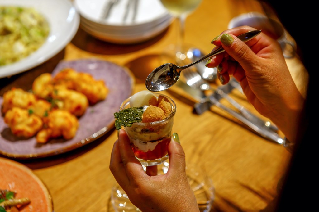 北杜市金精軒のお餅に、自家製はちみつアイス、ごまとクルミのクランブルなど、贅沢な和のお楽しみが詰まった信玄パフェは、小さいながらも様々なハーモニーが楽しめる。