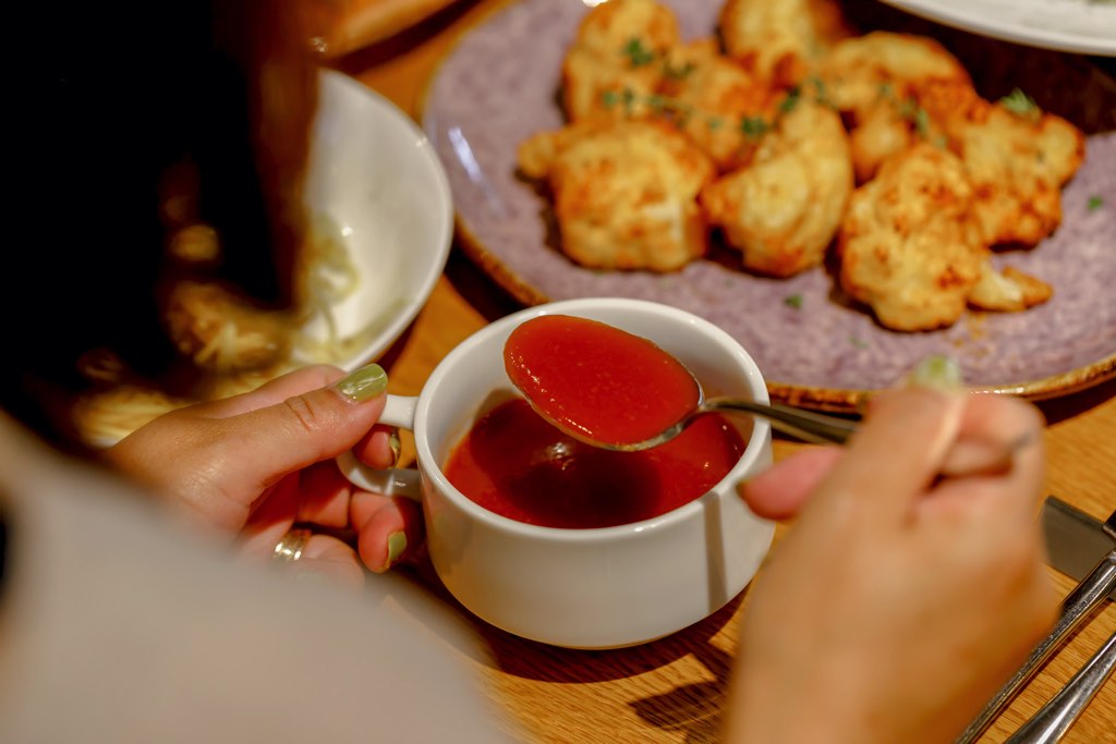 スープはアイコトマト100%!酸味が少なく、甘みの強いアイコの旨味をぎゅぎゅぎゅぅと凝縮、塩とオリーブオイル、クミンで整えたシンプルイズベストなお味♪