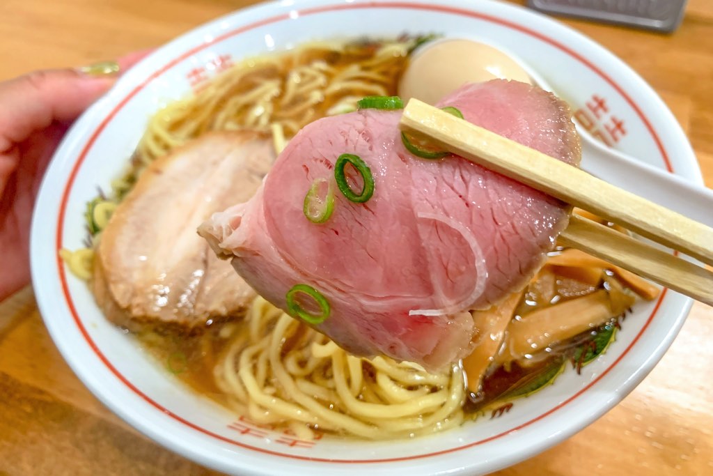 チャーシューはレアチャーシューとバラチャーシューの2枚がのって、なんとも贅沢に楽しめちゃう。大ぶりのレアチャーシューはしっとり柔らかで、とろっと脂まで美味しいバラチャーシューと味の違いを贅沢に堪能~。