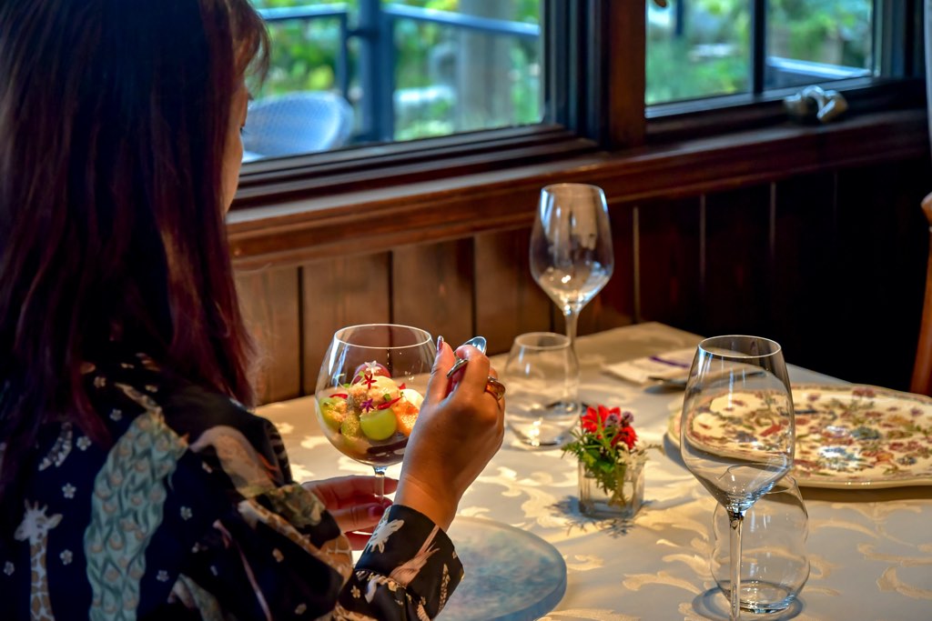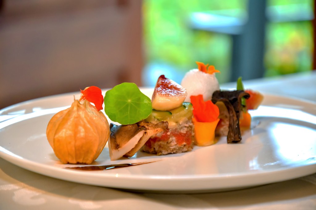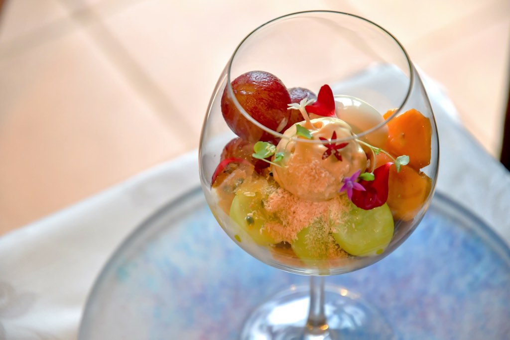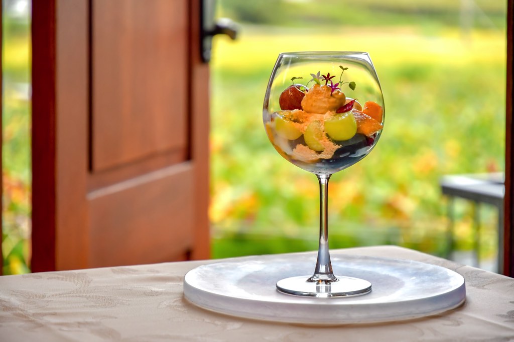 目の前に広がる自家菜園の葡萄をふんだんに盛り込み、濃厚な旨味が凝縮した喉越しのいいぶどうと赤ワインのジュレに、アールグレイムース、パッションフルーツと個性豊かな素材が絶妙なハーモニーを奏でる。