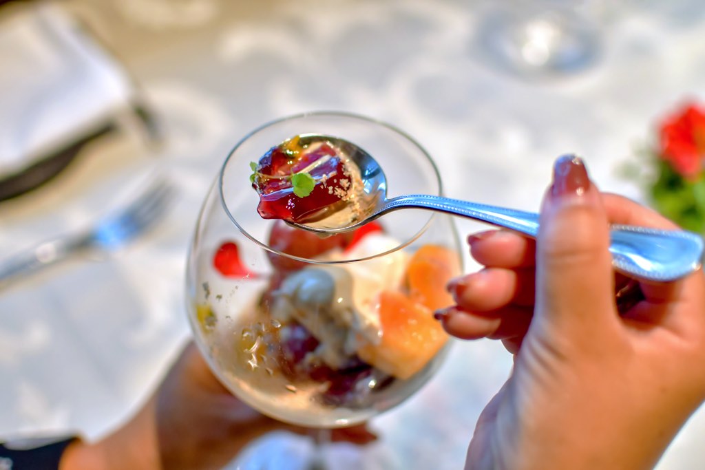 デセールは、まるでグラスの中にとじ込められた美味なる宇宙のよう。ため息が出るほど美しく、山田シェフの芸術的センスが光るクープ仕立て。