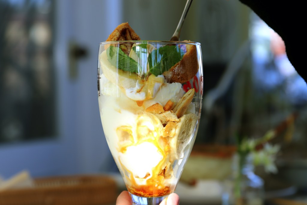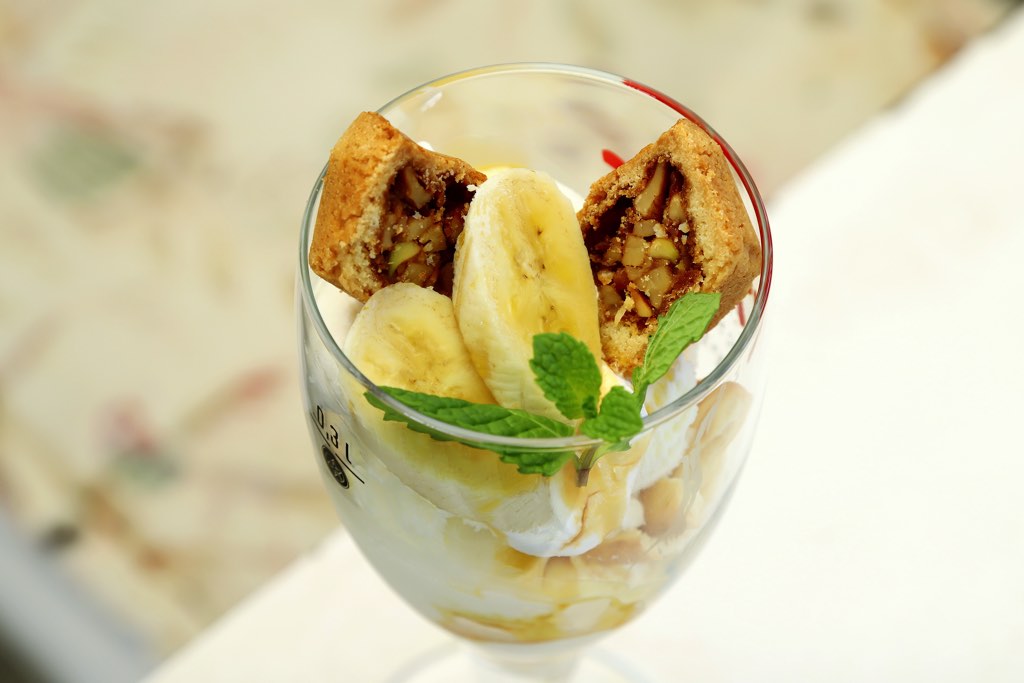 ほろ苦塩キャラメルと砕いたクッキーがアクセントになり、バナナの自然な甘みを引き立てる。