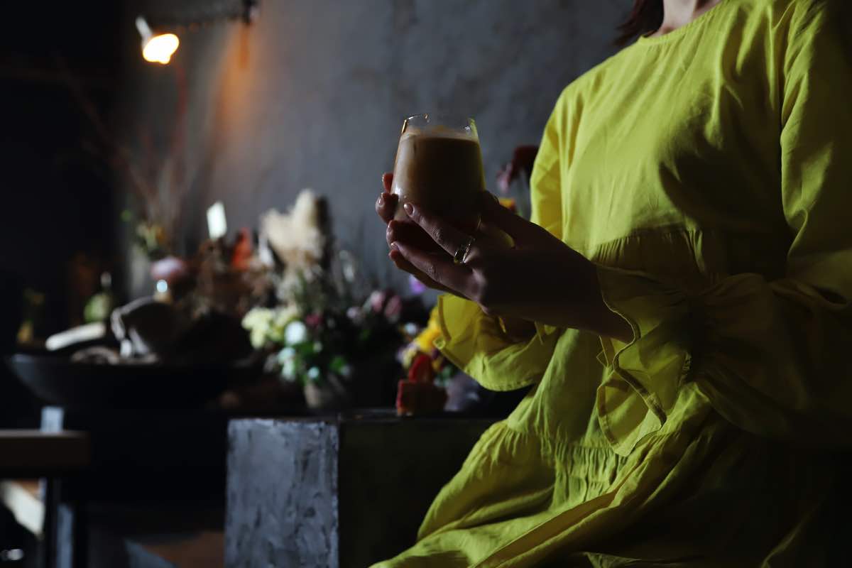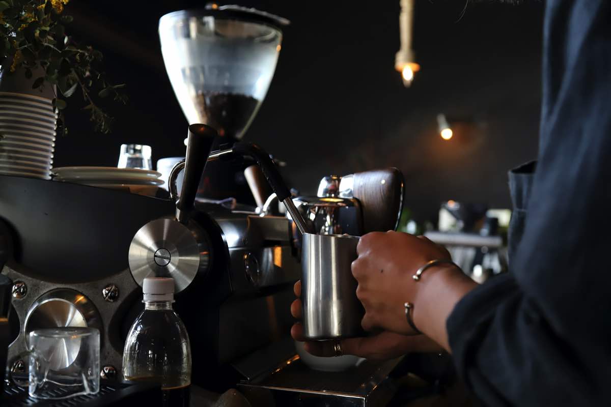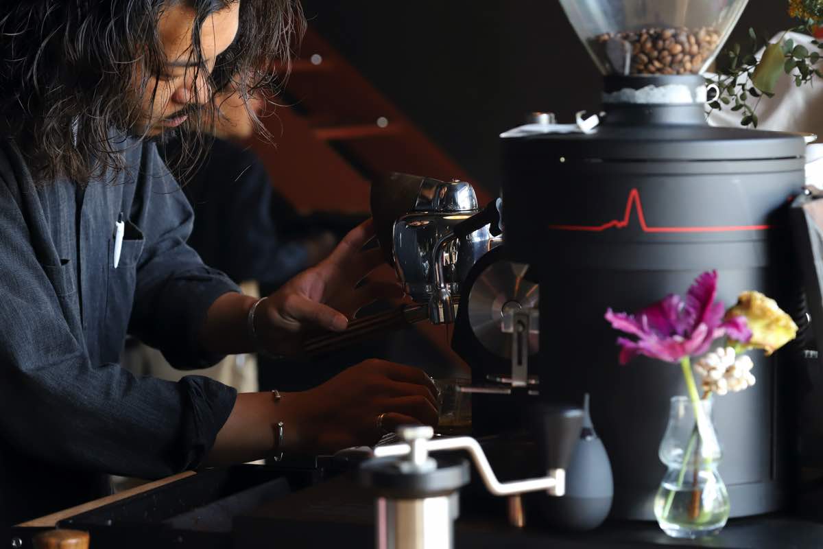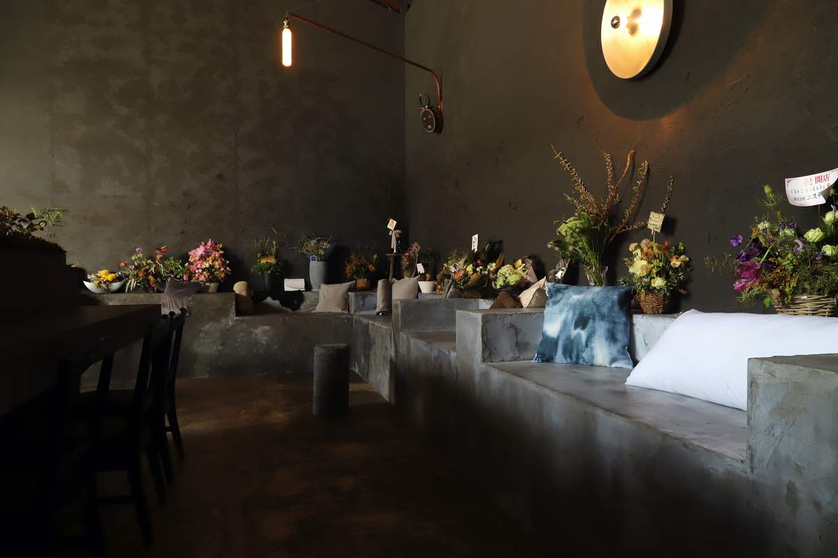 抽出後のコーヒーの粉を再利用し、モルタル調の壁の中に埋め込んでいたり、海外から輸入したアンティークのライトをあしらったりと、ダークで洗練された雰囲気に包まれ、カフェタイムを楽しめる。