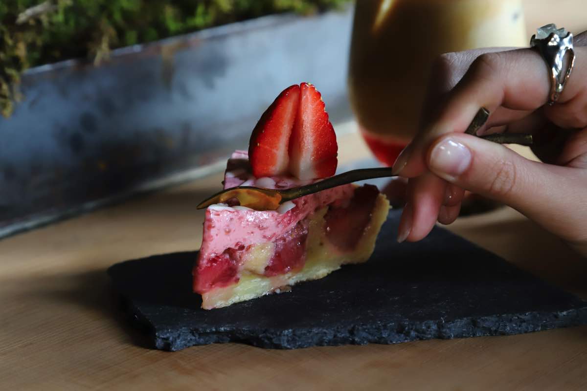 いちごの品種スターナイトを贅沢に使用した「焼き苺タルト」のムース部分は、ふにっとやわらかく、くちどけ豊かな味わいが口いっぱいに広がる。