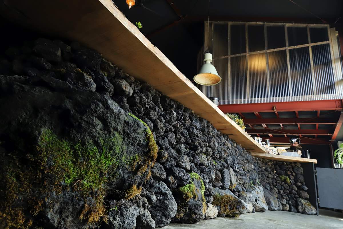 旧店舗でもインパクトのあった溶岩のカウンターはグレードアップし、さらなる迫力を演出している。