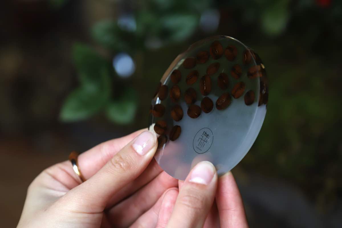 店内では、火災時に焼け残った珈琲豆を閉じ込めたコースターも販売中。