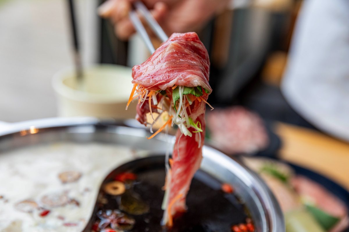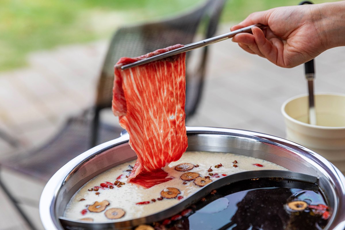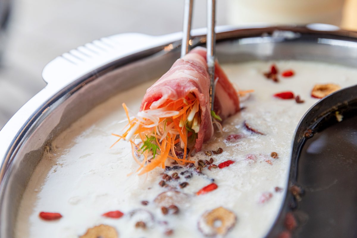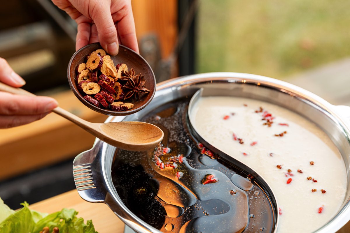 イチオシは発酵薬膳鍋!陰陽にちなんだ「白」と「黒」2種類のオリジナルスープと生薬で楽しむしゃぶしゃぶコースだ。
