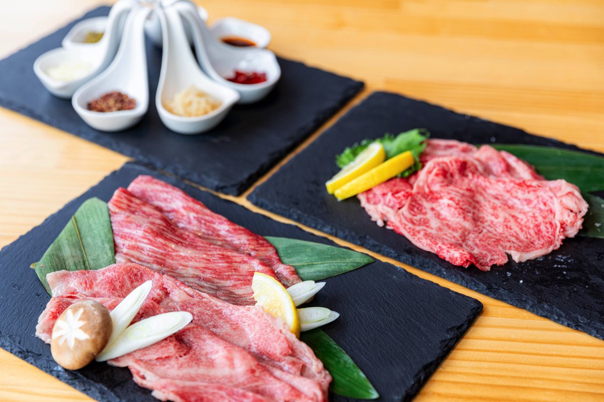 美しい霜降りのリブロースに、肉肉しい肩ロース、豊かな余韻を楽しめる赤身のバラなど、こだわりの県産食材を贅沢にしゃぶしゃぶしよう。