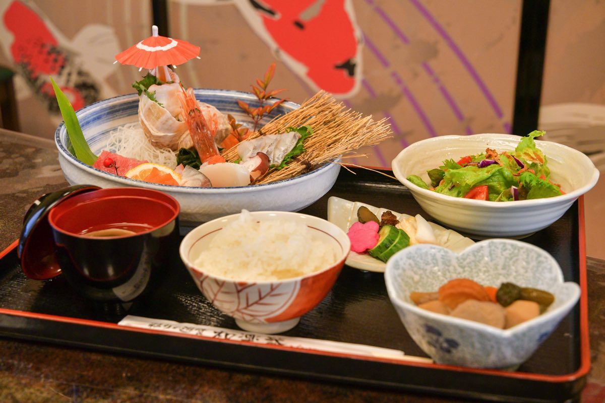 まぐろやエビ、イカなどの豪華なお刺身をメインに、サラダや煮物などの付け合わせがのった定食が到着!