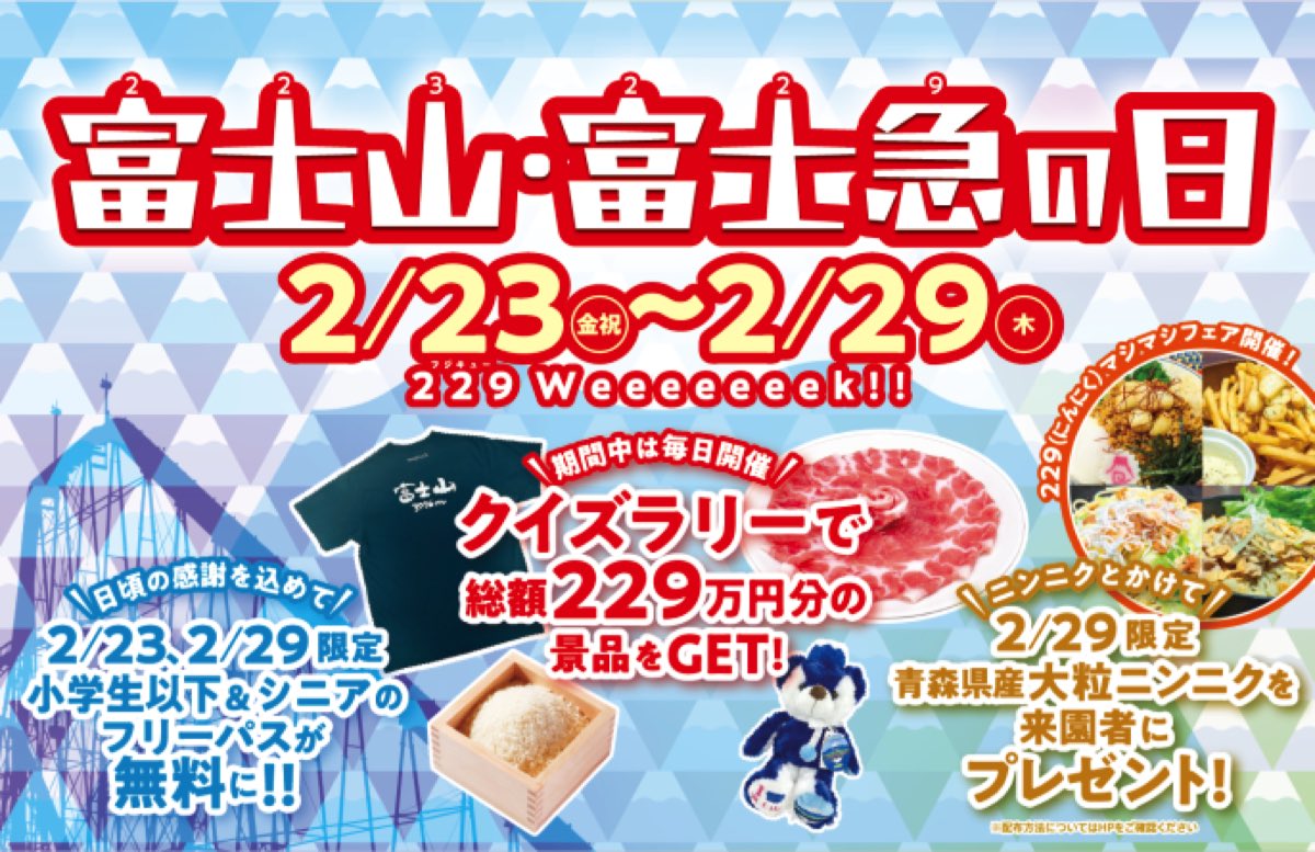 2024年2月29日は4年の1度の富士急の日!「富士山の日」である2月23日と「富士急の日」の29日の2日間限定で、幼児・小学生・シニア(65歳以上)はナント、フリーパス料金が無料に!!