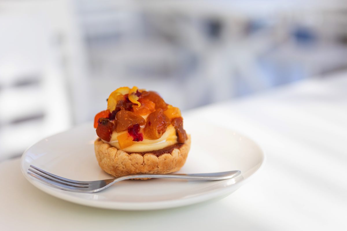 山梨の枯露柿、あんぽ柿にかりんのメンブリージョを重ね、ふわりと柚子が香る。タルトにもこだわり、パータフィロとパータフォンセという2種類のパイ生地を組み合わせ、カリカリとサクサクを同時に楽しめる、完全オリジナルのタルトに仕上げた。
