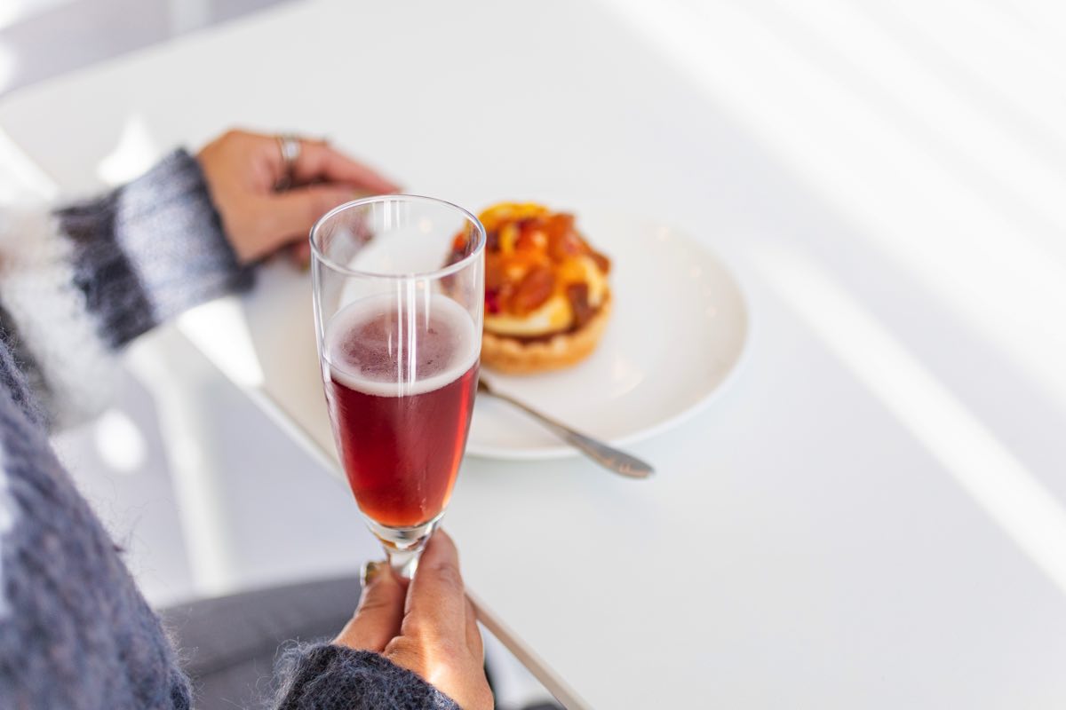 ペアリングには華やかな赤のノンアルコールスパークリングカクテルを。フルーティなすっきりとした甘さで、贅沢なマリアージュを満喫できそう。