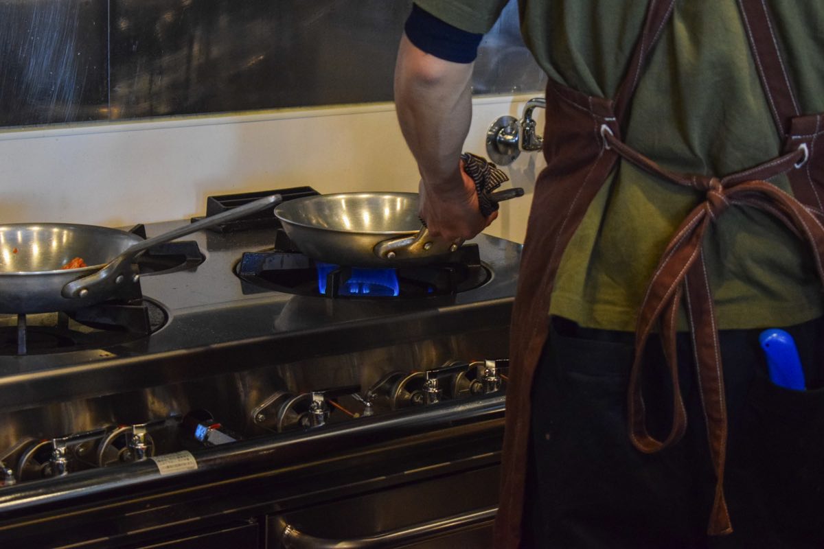店内はフルオープンキッチンで、カウンター席と4人掛けテーブル1つ、6人掛けテーブルが1つ。