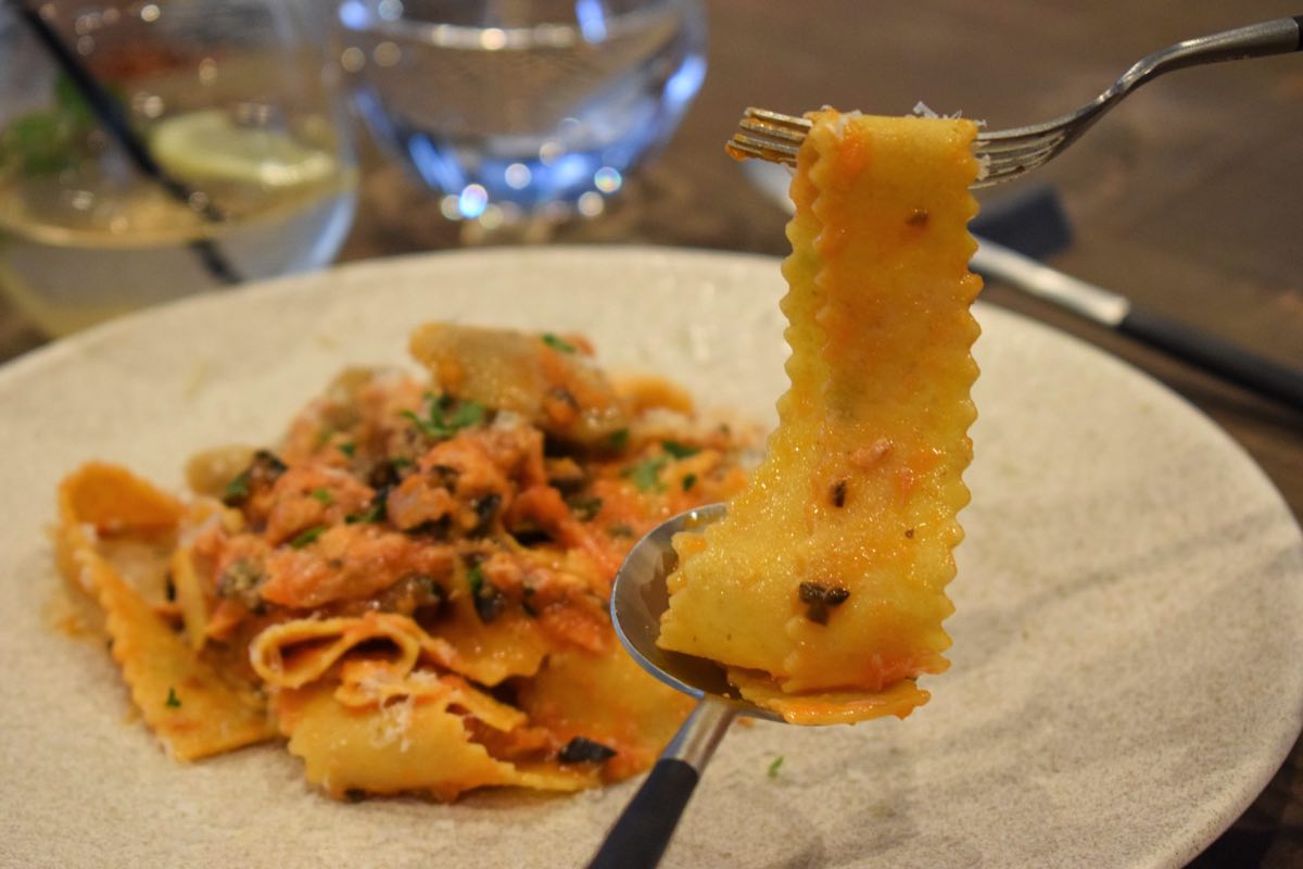 そして、メインに負けず劣らずの存在感を放つ手打ちパスタ~。取材日はそば粉のニョッキ、全粒粉のパッパルデッレ、マッケローニの3種類からセレクト可能。