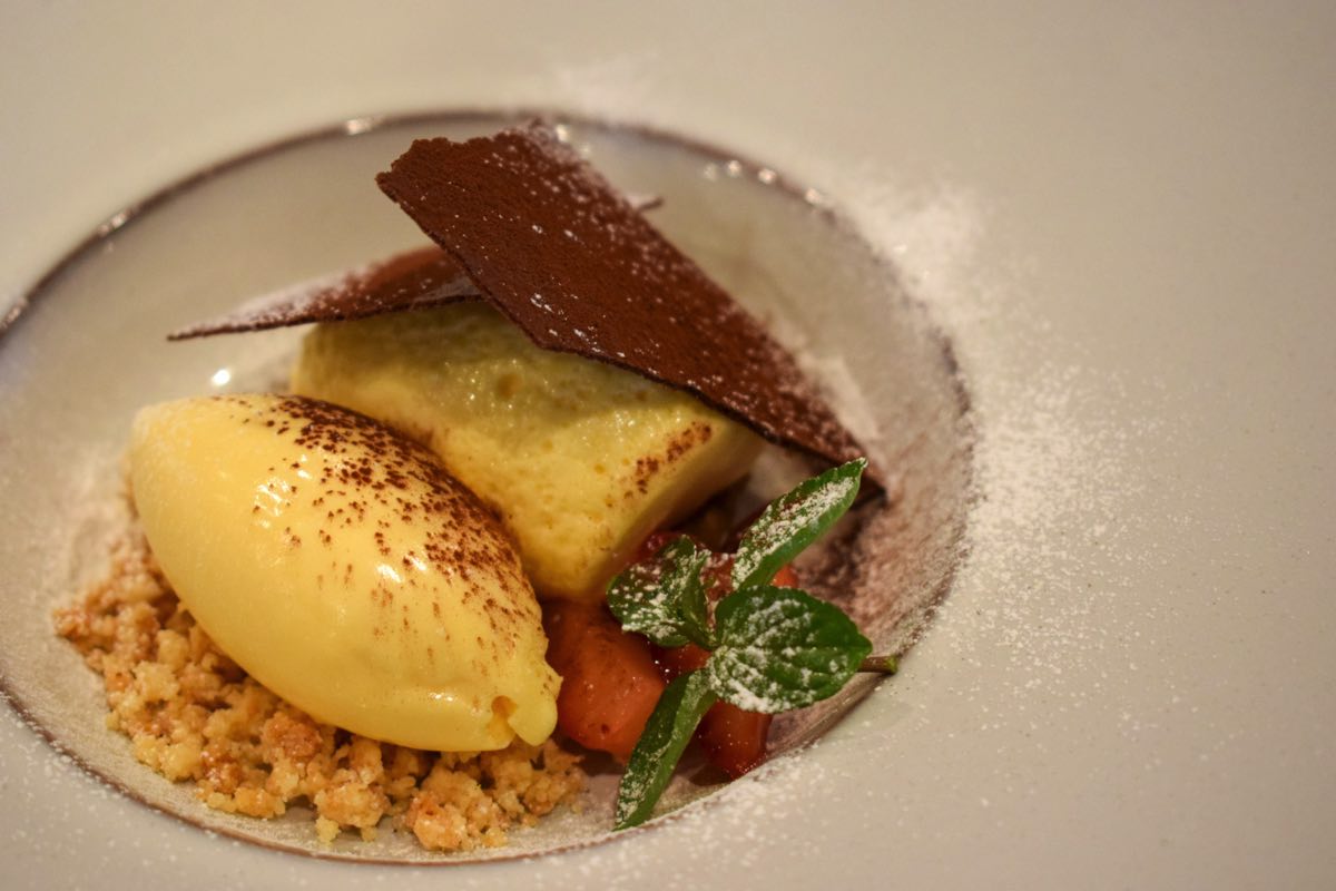 食後のドルチェは、自家製ティラミスと七賢の酒粕を使った甘酒のジェラート。甘酒の旨味が凝縮されたジェラートが、ティラミスの優しい甘みとコクを引き出す。