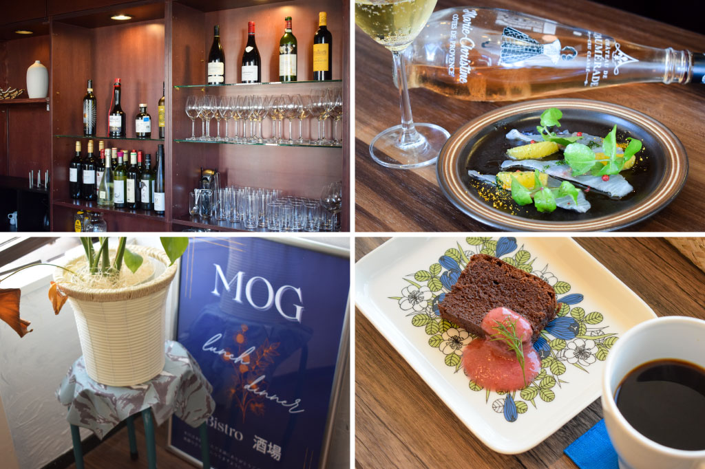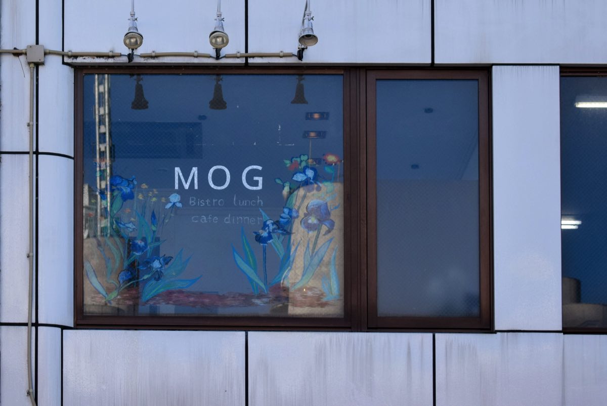 甲府駅北口から歩いてすぐ。控えめな小さな入口が隠れ家感を漂わすビストロ酒場「MOG(モグ)」が2024年3月1日オープンした。2階の窓ガラスに描かれた、おしゃれなペイントが目印!