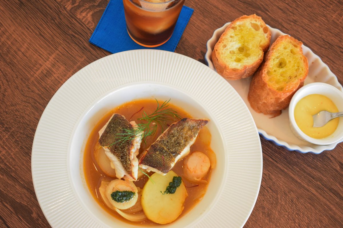 こちらのバゲットは、ブイヤベースにも欠かせない名脇役!本日の鮮魚のブイヤベースはアイナメで、魚介の旨味がぎゅっと凝縮されたスープに、アイナメがほっくりと甘く華やかだ。