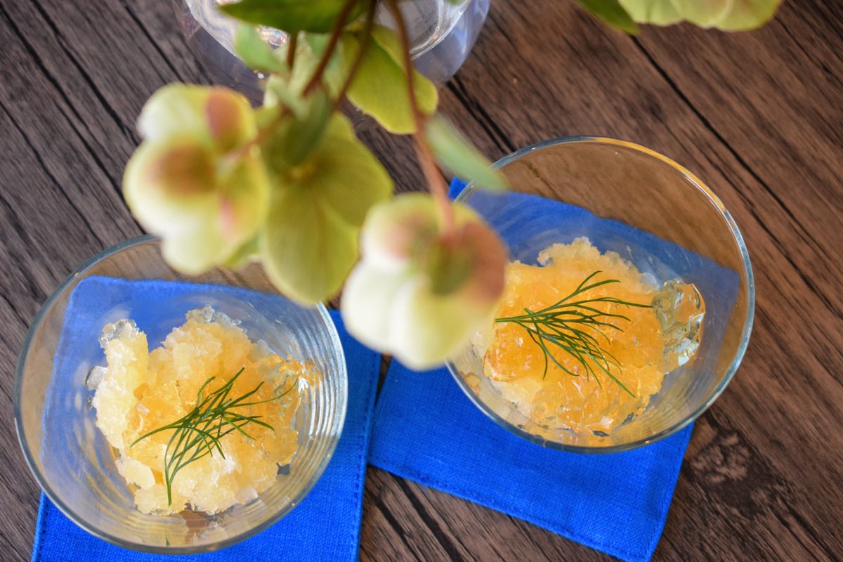 アールグレイとオレンジのシャーベットに、きらきら美しいスパークリングワインのジュレをあしらった「本日のデザート」は、甘酸っぱいりんごのコンポートを忍ばせて。美味しさに美しさをプラスしたデザートが、より印象的に食事の最後を締めくくる。