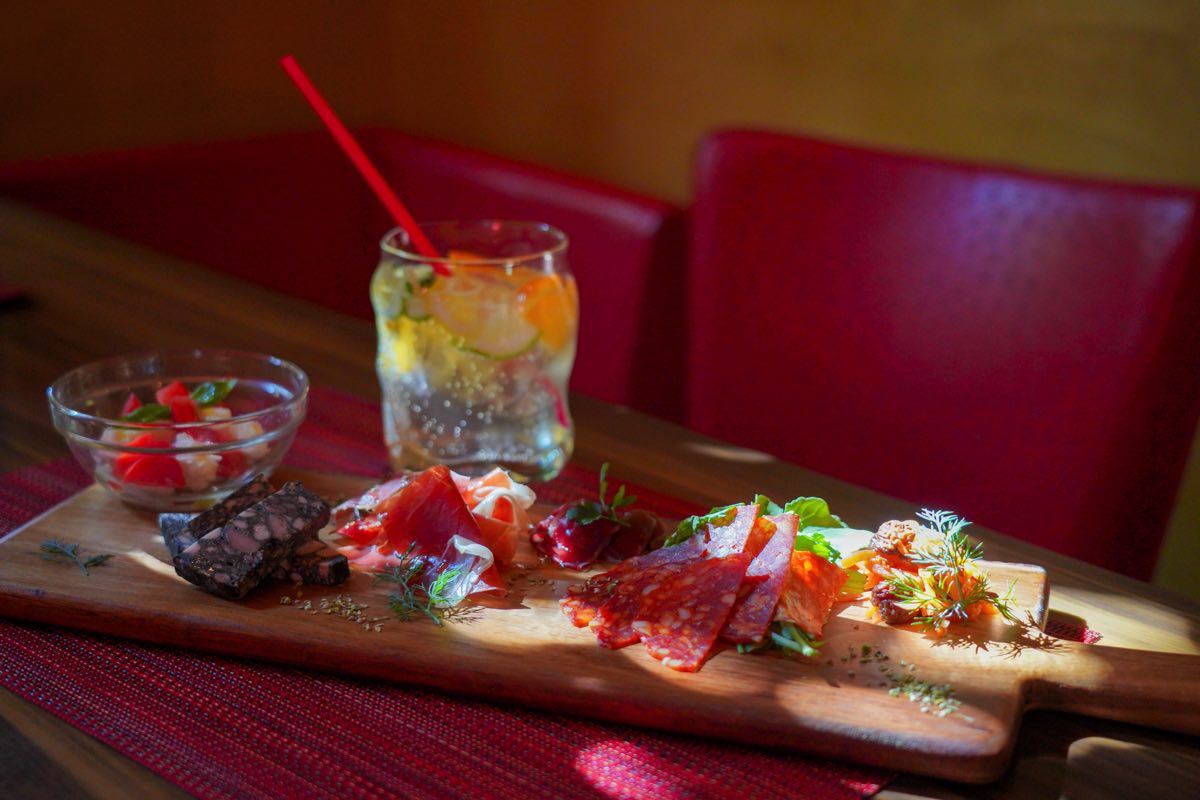 イカスミのオリジナルパテや鹿のハム、自家製キャロットラペ、高品質のスペイン産生ハムなど、こだわりの前菜がズラリ。アルコールはもちろんだが、ノンアルでも見目麗しいカクテルドリンクが揃うのも嬉しい。